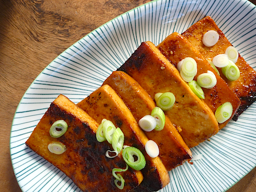 - Heat oil in cast iron pan or barbecue plate and gently fry tofu steaks on both sides until golden brown and edges are caramelised.