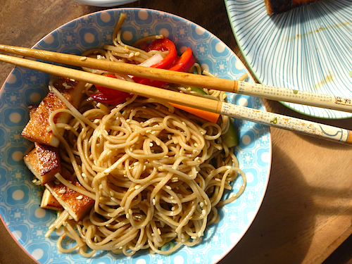 The recipe for the tofu’s hoisin marinade comes from the Tassajara Cookbook: Lunches, picnics and appetisers by Karla Oliveira. If you are cooking these tofu steaks on the barbecue, just make sure you add some oil to the plate and turn the heat down a little. You want gently caramelised edges on your tofu steaks, not scorched burnt ones. You can also just cook them on the stove in a cast iron pan. My family’s been having a bit of a love affair with soba noodles over the past few years – we have them in soups, with stir-fried veggies and as the fastest meal on the planet for my son, which is broccoli cooked with the noodles for four minutes and served with tamari and tuna. There are so many recipes for sesame soba noodles but I love the simplicity of this garlicky, vinegary and sweet dressing that I discovered on the blog Sweet Amandine. It’s great as a base to add veggies to or serve as a side to any number of dishes.