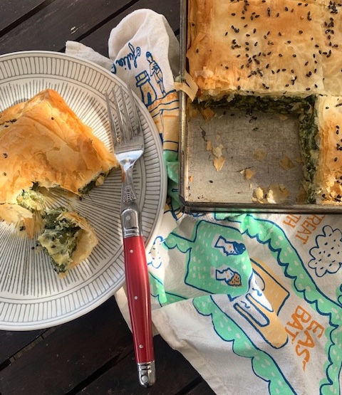 I remember first making spanakopita when I was about fourteen. I substituted cottage cheese and grated cheddar for the feta, silver beet from the garden for the spinach and because filo pastry was completely unheard of in the small country town I came from I made a kind of layered wholemeal pastry from one of my older sister’s wholefood hippy cookbooks. I can’t remember if I used any herbs (but probably not) and the pastry was kind of weird and a bit tough. but overall it wasn’t that bad and it certainly didn’t put me off the whole notion of spinach and cheese pie. Later, when I left home became a vegetarian, spanakopita became part of my standard repertoire and has been festive centrepiece for many celebratory meals. I’ve made it in various incarnations, experimenting with different cheese combinations and various herbs. For a while I was adding rice and making a very thick pie. Then a few years ago I was brought back to my senses by a recipe from Jill Dupleix’s Favourite Food. This is a simple, elegant spanakopita, made how it should be,  with just spinach, feta, green onion, dill and egg encased in golden buttery layers of filo (which is thankfully readily available now) and it is simply the best spanakopita I have ever made. I know it’s definitively the best now, because when I first started this blog last year, I wanted to post a spanakopita very early on. You think I would have learnt from years of messing around with this pie that it’s best NOT to mess around it, but I’d cut out a recipe from the newspaper that promised to be the ultimate spanakopita. It looked great on paper with loads of mint, parsley and dill – my favourite herb combination. How could it go wrong.? It even had impeccably authentic credentials coming from the writer’s local Greek veggie shop owner, Maria.  I made it, photographed it – it even looked fantastic – but it was all a bit meh.  In fact it was a bit dry and dense a fatal failure in spanakopita which needs to be eggy and airily light.