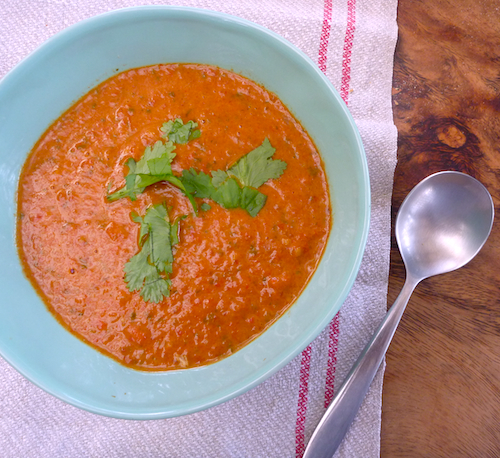 If you don’t have any chipotle chilli, don’t be put off making this soup because it’s still perfectly delicious with a substitute of smoked hot paprika or just plain chillies. The recipe originally comes from Cooking with Kurma by Kurma Das. Kurma is a Hare Krishna vegetarian cook and replaces all onions and garlic with asafoetida in his recipes. As I don’t have anything against onions and garlic (in fact, I find it difficult to cook without them) I’ve put them back in for this recipe. The addition of peanut butter makes this a fantastically creamy, vegan soup, its richness offset by copious amounts of coriander. For the coriander-phobes out there, I don’t really know what you could replace it with because it does really make this soup sing.
