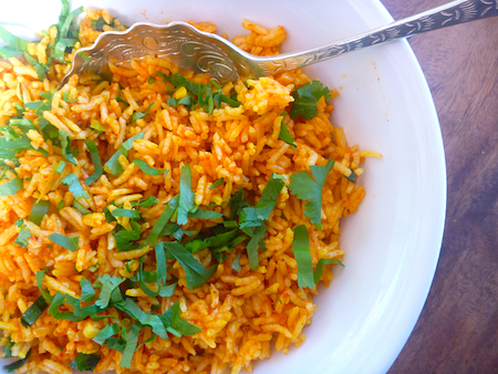 This recipe comes comes via the recipe site SImply Recipes, which is my ‘go to’ source  for Tex-Mex food. The secret to a good Spanish rice is to saute the rice in olive oil until golden brown. Pureed tomato or tomato paste adds color but I also add paprika and some tumeric, neither which are traditional, but give the rice an added depth of color and flavour. Traditionally, chicken stock is used, but for this vegetarian version, I use a good vegetable stock (a carrot-based stock works really well) and I’m generous with the olive oil because that gives the rice a slight stickiness without causing the grains to disintegrate or clump together.