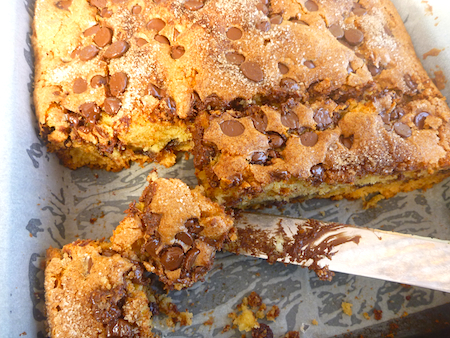 - Cover the top of cake with the cinnamon sugar, then chocolate chips, and gently press the chocolate chips into the cake batter until they stick to the top.