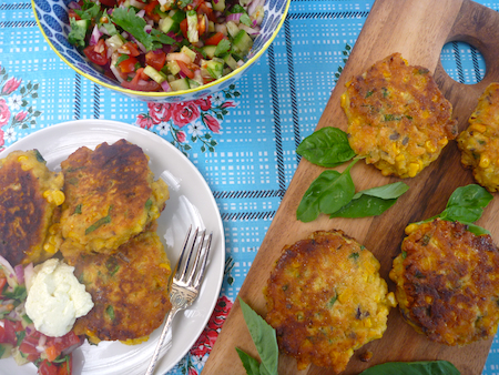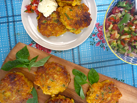 I serve these corn cakes with a simple fresh salsa – which is usually made up of what ever herbs or veggies I have around and dressed with some lime or lemon juice. This one was simply made up of tomato, cucumber, coriander and red onion and dressed with some lemon, hot sauce, salt and pepper. The fresh salsa really perks up these corn cakes but but we’ve taken to eating these with whipped feta, which takes the whole thing onto another plane of deliciousness.