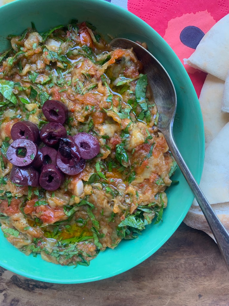 I love this time of year when you get the occasional day with a hint of autumn but you have the best of the summer bounty to cook and eat. Eggplant and tomatoes always have a taste of summer to me and, combined as one dish, they make an unbeatable combination. This particular eggplant salad is from Morocco and is both lavish and simple, and provides all the reasons for why I love Arabic and middle-eastern food. Eggplants are cooked over an open flame until tender, then mashed with a reduced tomato and garlic sauce, then dressed with olive oil, lemon, spices, and a generous amounts of coriander and parsley.
