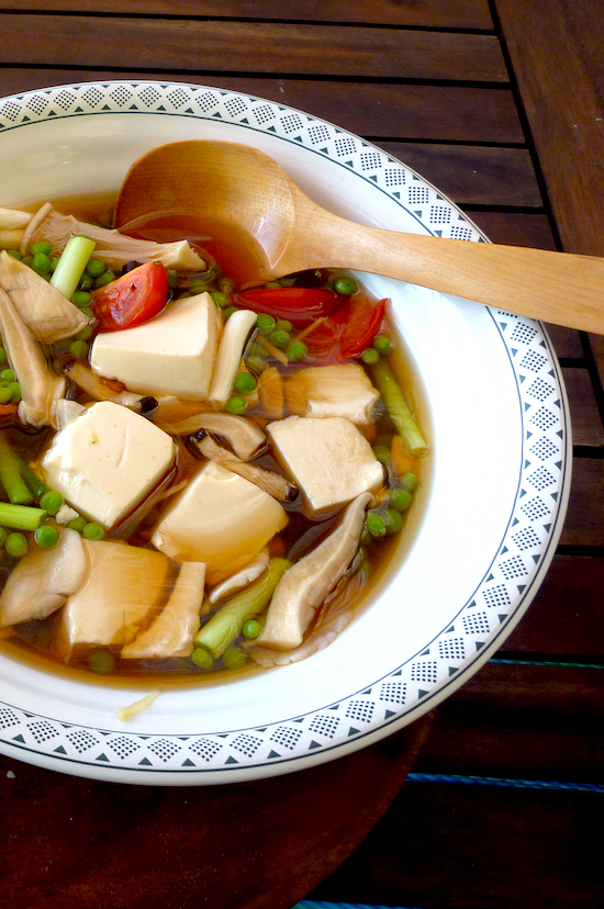 3. Gently slide tofu, tomato, mushrooms, peas and spring onions into broth, separating the tofu as you place it in the broth. Simmer uncovered for five minutes until vegetables are just tender.