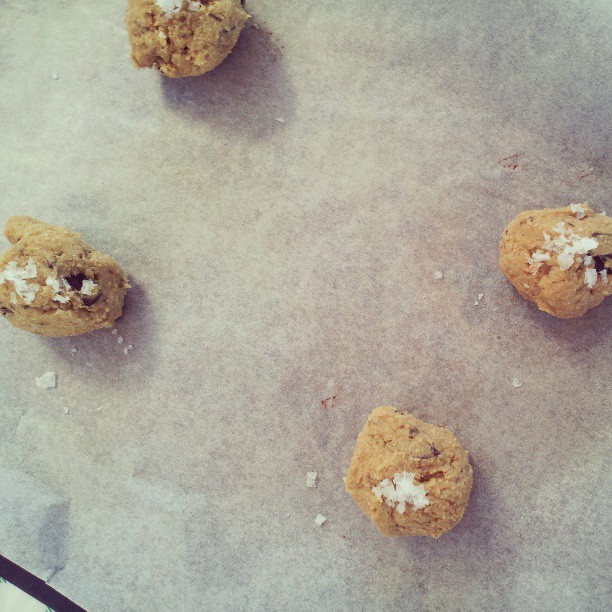 - When you are ready to bake you cookies preheat oven 175C (350F) of 150C fanforced. Place cookies on baking sheet about two inches apart and sprinkle tops with some salt flakes. Bake cookies for 16-20 minutes until lightly golden.