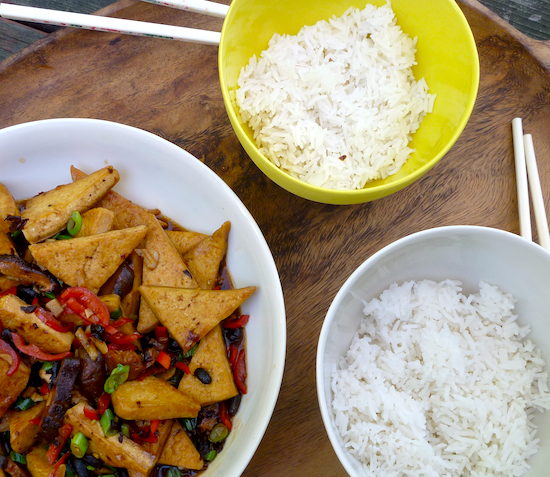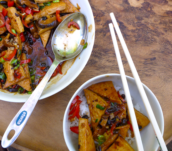 There are many versions of home-style tofu which is pan fried or deep fried tofu, simmered in broth with chilli and other seasonings. Like the best of Chinese home cooking, it is simple, frugal and delicious. This version of home-style tofu comes from the Taiwanese restaurant of the legendary Hunanese chef, Peng Chang-kuei. I’ve made it vegetarian by cutting out the ground pork and using a simple vegetarian stock made from simmered black beans (recipe below).
