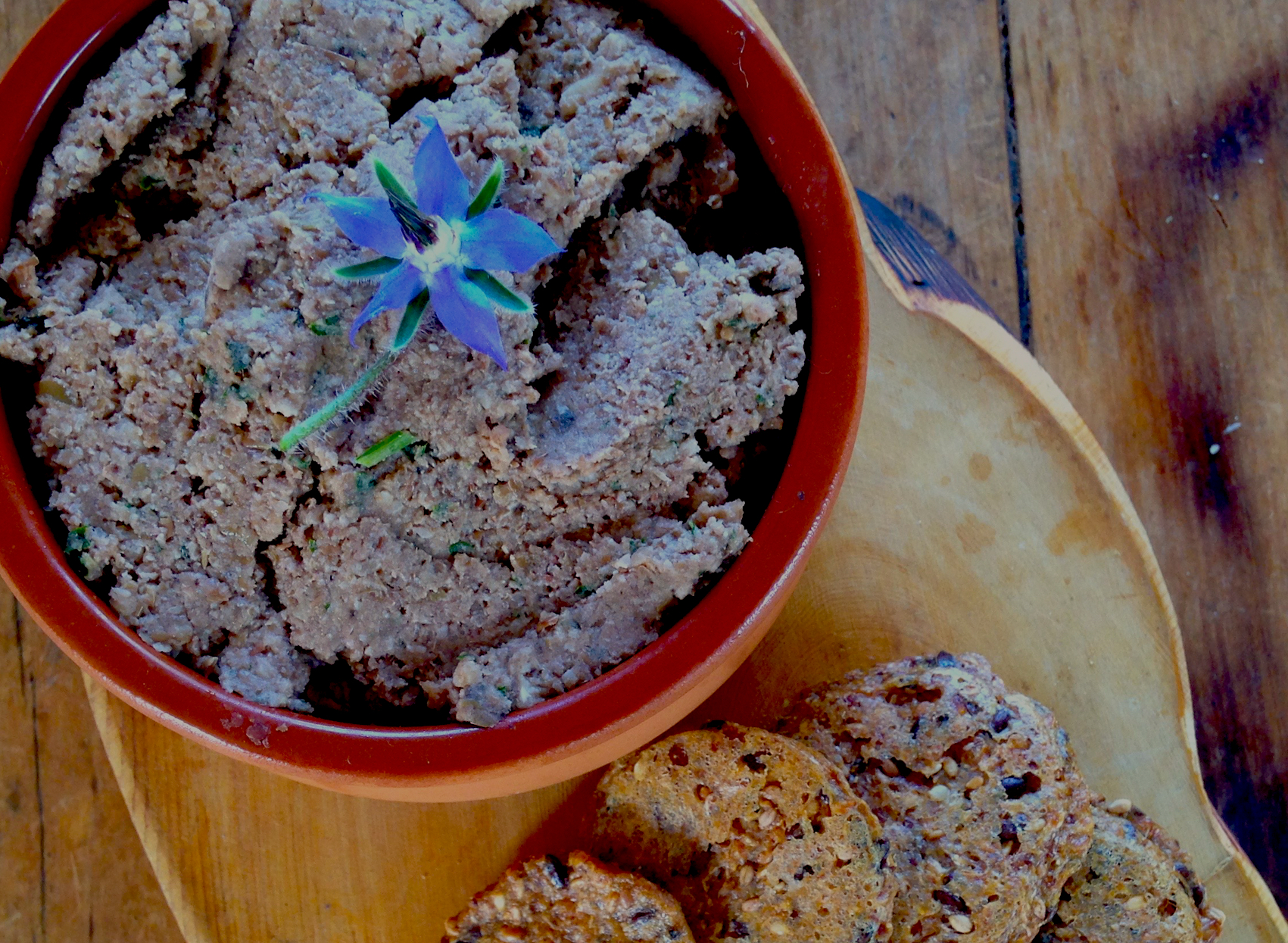 This faux foie gras has something of a retro feel of a vegetarian food from the 1970s: all very herby and lentilly, and you can imagine it being served in a hand-thrown ceramic pottery and being eaten by kaftanned, sandal-wearing party goers at a slightly Bohemian suburban party. Apart from the borage flower picked from my brother and sister-in-law’s garden (thanks Jane!), the photograph makes it look like a study in brown, but trust me – this faux foie gras is really delicious. The recipe makes a large batch but it freezes spectacularly well. In fact, the flavours seem to develop further after a stint in the freezer. If you want to make it vegan, leave out the butter and double the olive oil – I used Saint Omer Tasmanian butter for the batch I made for New Year’s Eve and really good walnuts from the Hill Street Grocer (a Tasmanian foodie institution) and it was so worth it. I also use a bit more herbs, with both parsley and sage (if you can get sage it does give a bit more of a foie gras/pâté flavour). So, buy the best walnuts and butter, throw on some Leonard Cohen and Neil Young and celebrate a back-to-the-future 2016.
