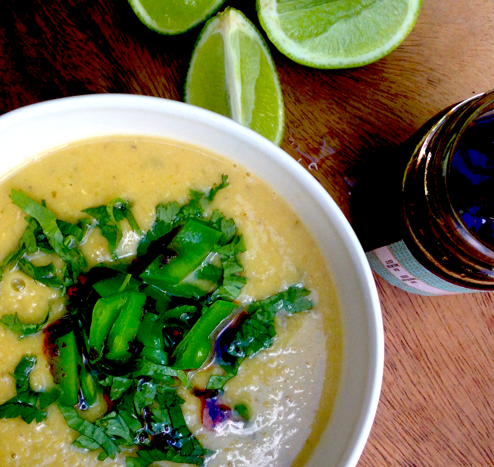 Finally, Sydney has a bit of a cold snap, making it feel like a proper winter at last. In the cooler months, there’s no such thing as too much soup. This Thai red lentil soup from Yotam Ottolenghi is wonderfully aromatic, rich and warming. I’ve doubled the original recipe because I found it didn’t quite make enough soup for my needs (leftovers for another meal are essential). Scattered liberally with snowpeas and coriander for the greens component, it becomes a complete meal. Unusually for me, I don’t think it even needs bread on the side. I have, however, served it alongside pan fried gyoza dumplings for dinner turning it into a feast.