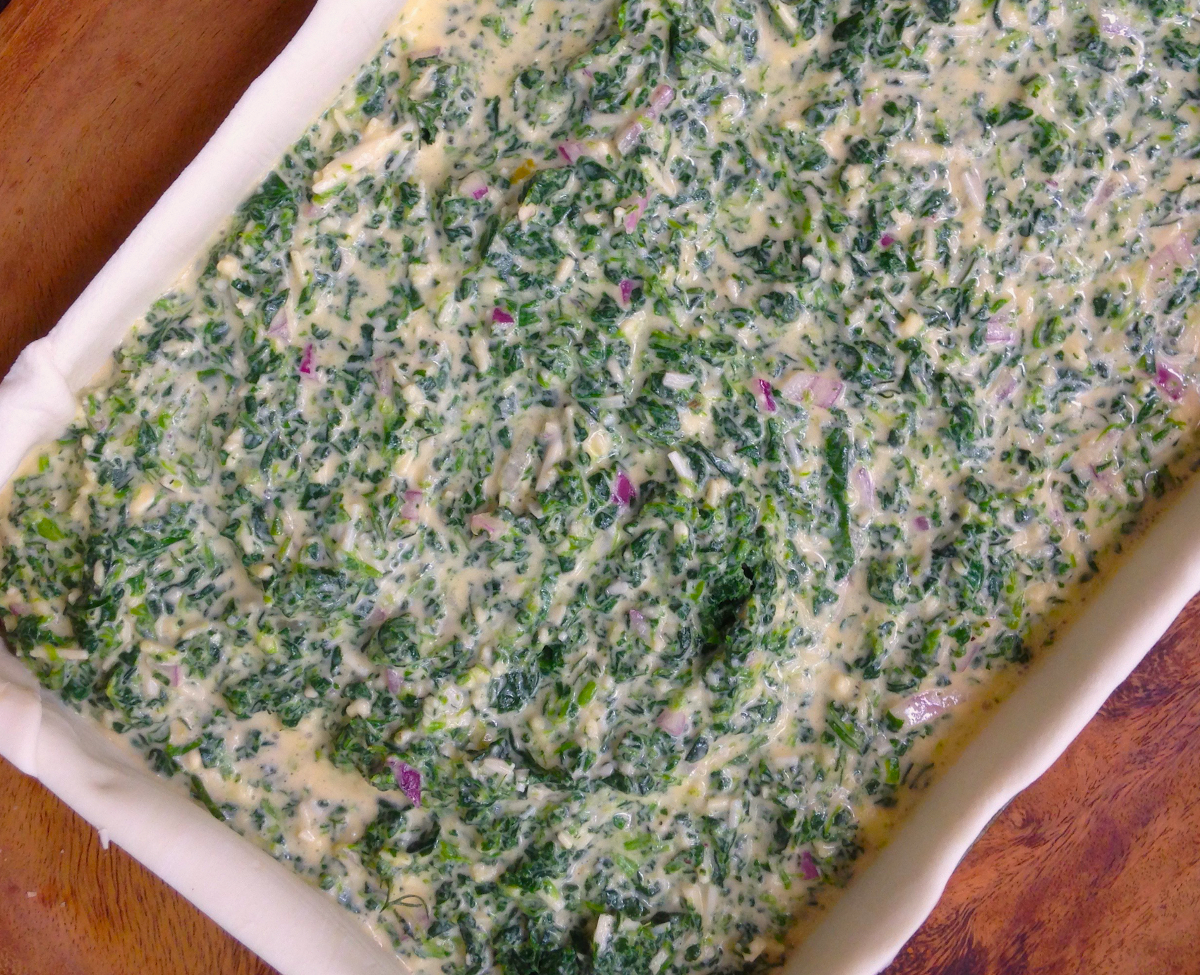 - Use a hand beater or a wooden spoon and whisk to beat cream cheese until fluffy. Gradually add milk and cream and beat in until combined. Then add eggs two at a time and whisk through until smooth. Squeeze out spinach in a fine sieve and get as much liquid out as possible. Stir through onion, cheese, spinach and salt and pepper through egg mixture.