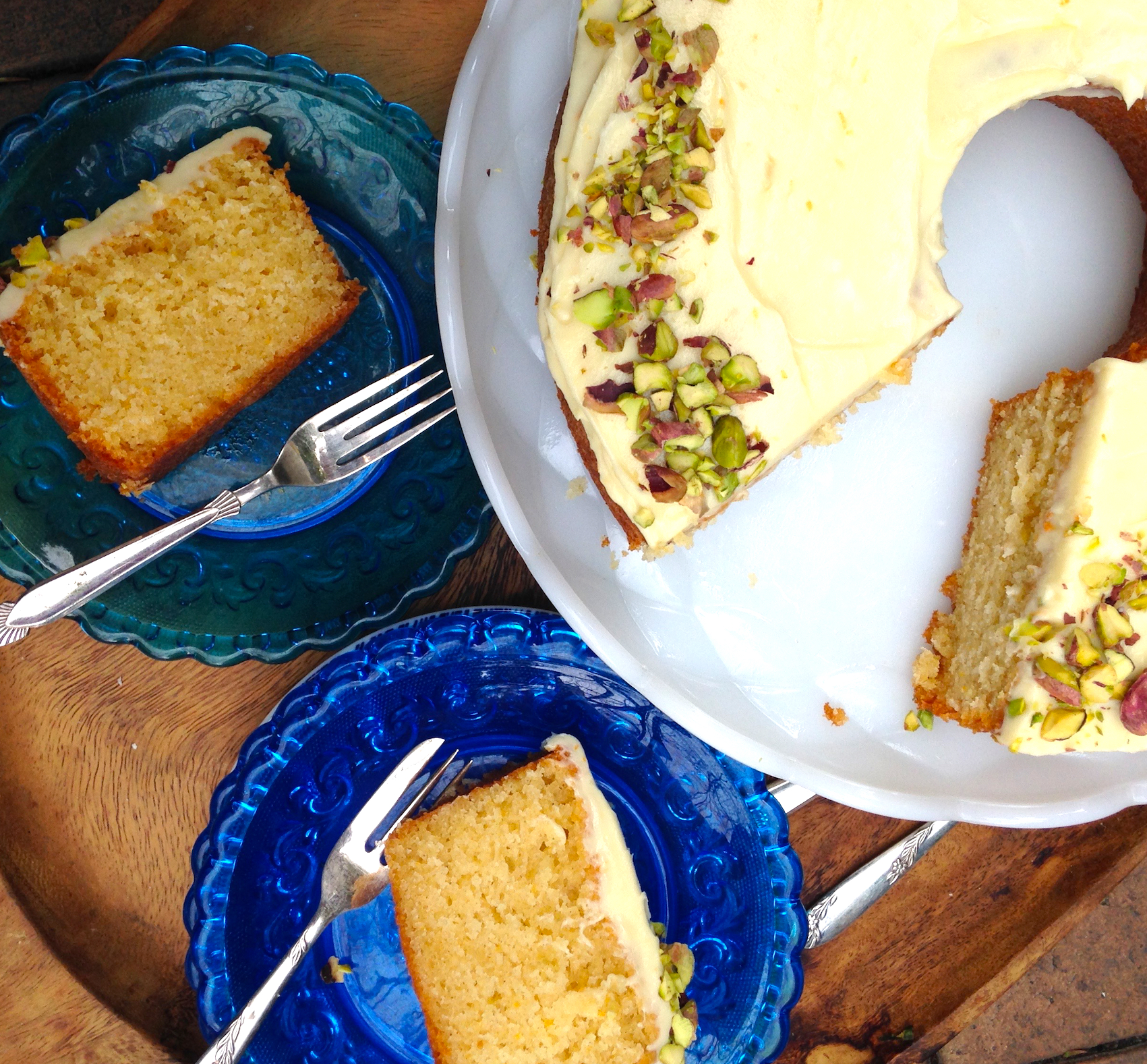 This would have to be one of the easiest cakes in the world to make. It’s simple enough to whip up for an afternoon tea but spectacular enough to shape shift into a celebration cake. The lightly sweetened cream cheese icing and chopped pistachios give a slight, savoury contrast to the sweetness of the cake. This is a velvety, moist cake that keeps superbly for days. In fact I think it could be even better after a few days in the cake tin, the orange and cardamom meld and become more intense. I love cakes that can be forgotten about and discovered a few days later, for a delicious surprise afternoon tea.