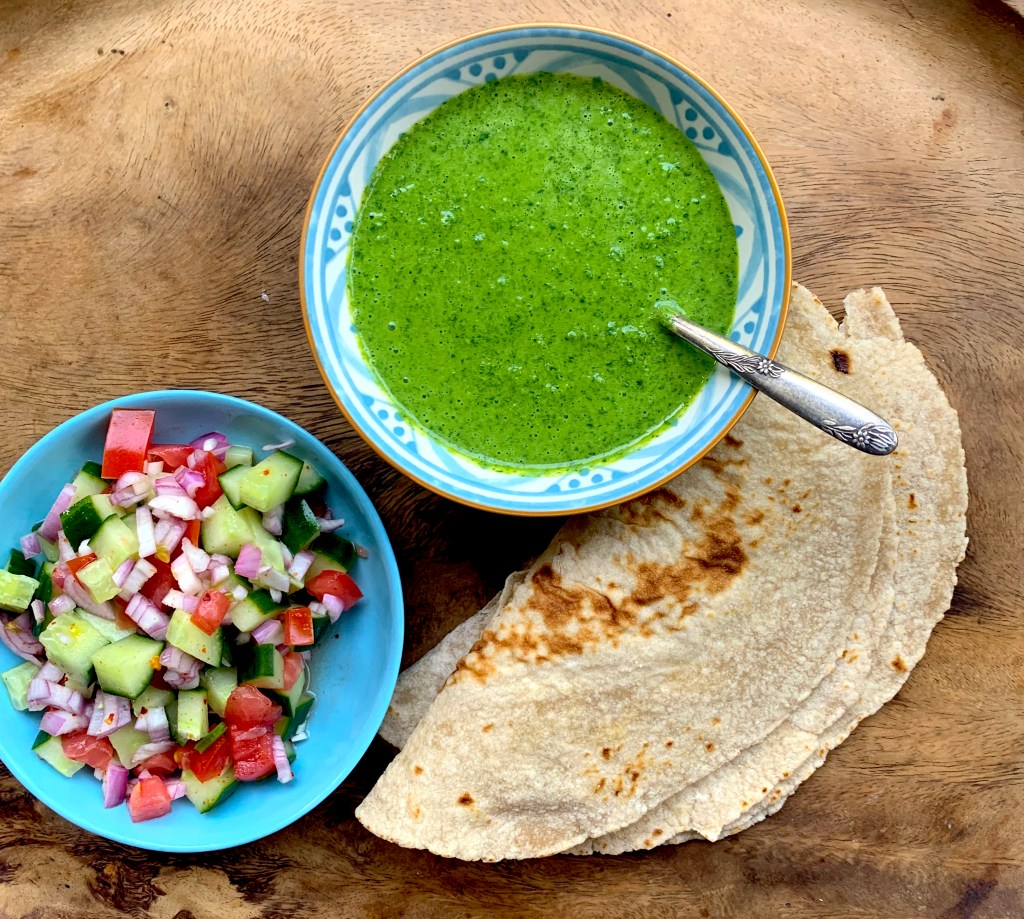 These chickpeas go really well with all types of flat breads or even tortillas, add a chopped salad and a yogurt raita and you have super quick delicious dinner. My favourite accompaniment to these chickpeas is a cucumber and tomato salsa, chapatis and a green chutney The fresh green chutney is also from Vegetarian India, it’s fresh and zingy and gets a dollop of greens into a meal. If you want to make this chutney more of a yoghurt raita replace the four tablespoons of the water with yoghurt.