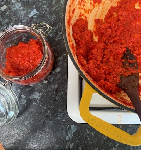 - Return peppers to the pan, season with salt and cook paste slowly over a low heat. Stir continuously so it doesn’t burn, until the juices have evaporated and the paste has darkened and reduced by half. (About 30-35 minutes) Remove from heat.