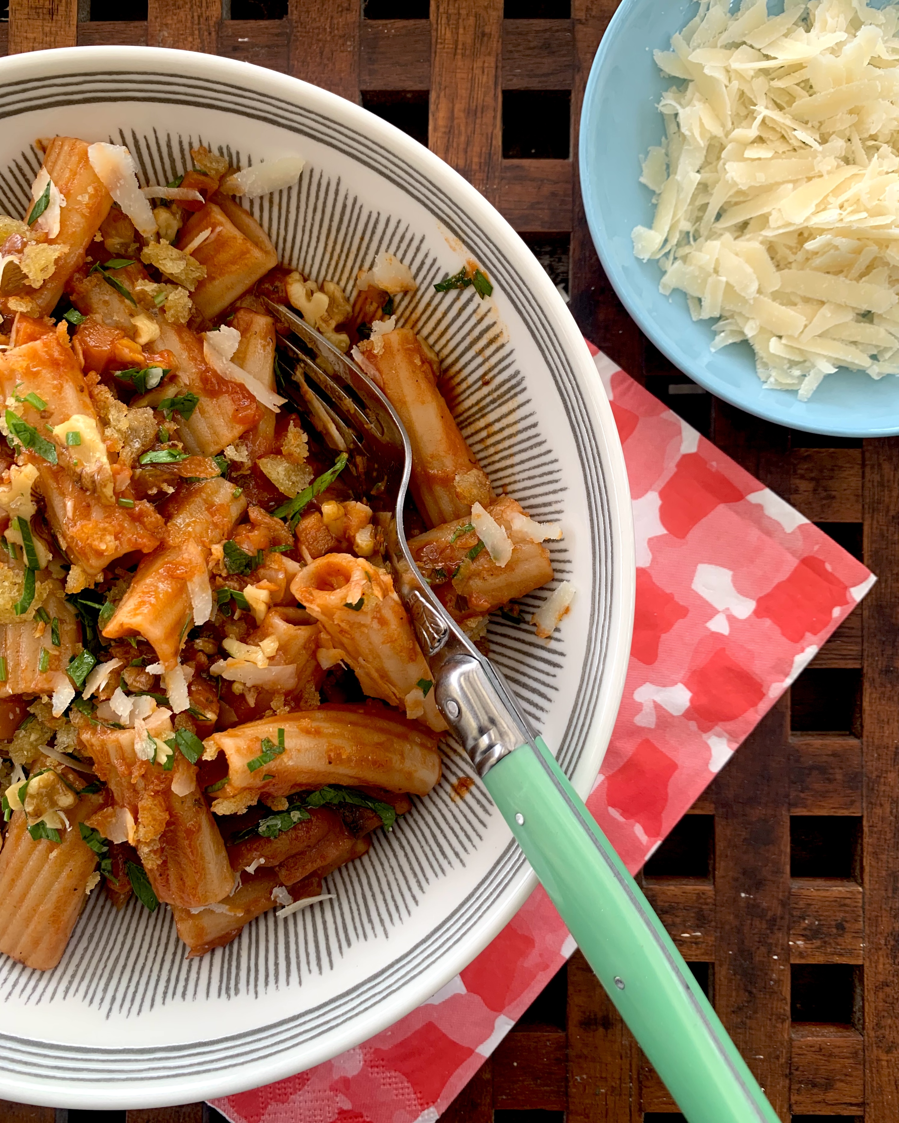 If you want to keep this dish completely vegan, the pangratatto really elevates the final dish and gives a nutty, crunchy textural contrast to the richness of the sauce.