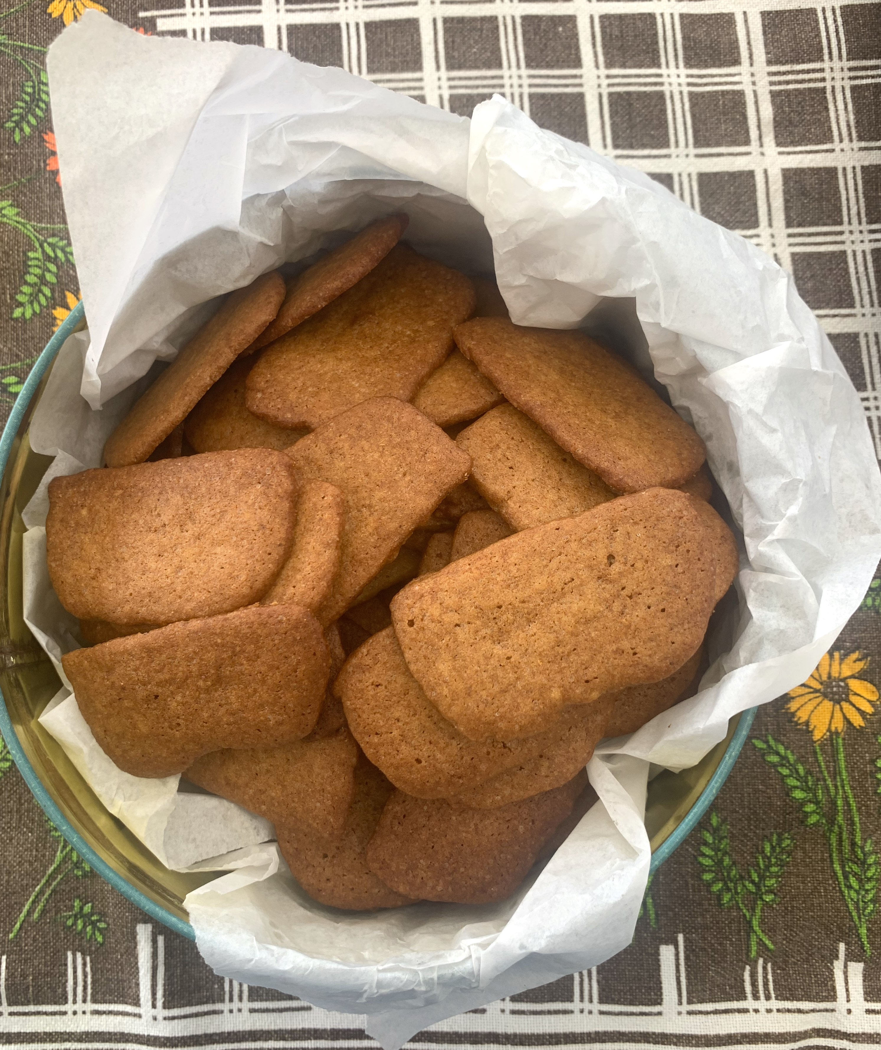 These Swedish ginger thins are a brilliant Christmas cookie for the Australian conditions. You make up the dough, stash them in the freezer for 24 hours and in the cool of the morning or evening or whenever you can bear to put on the oven, you bake them off. I usually make two double batches of this dough and bake them off in tranches over the festive season. I generally have enough to see me through to Easter. This dough lasts brilliantly in the freezer. A fact I verified this year in June when I unearthed a lonely log of dough from the depths of my freezer from a Christmas 18 months past. I sliced and baked it and it still baked up beautifully.