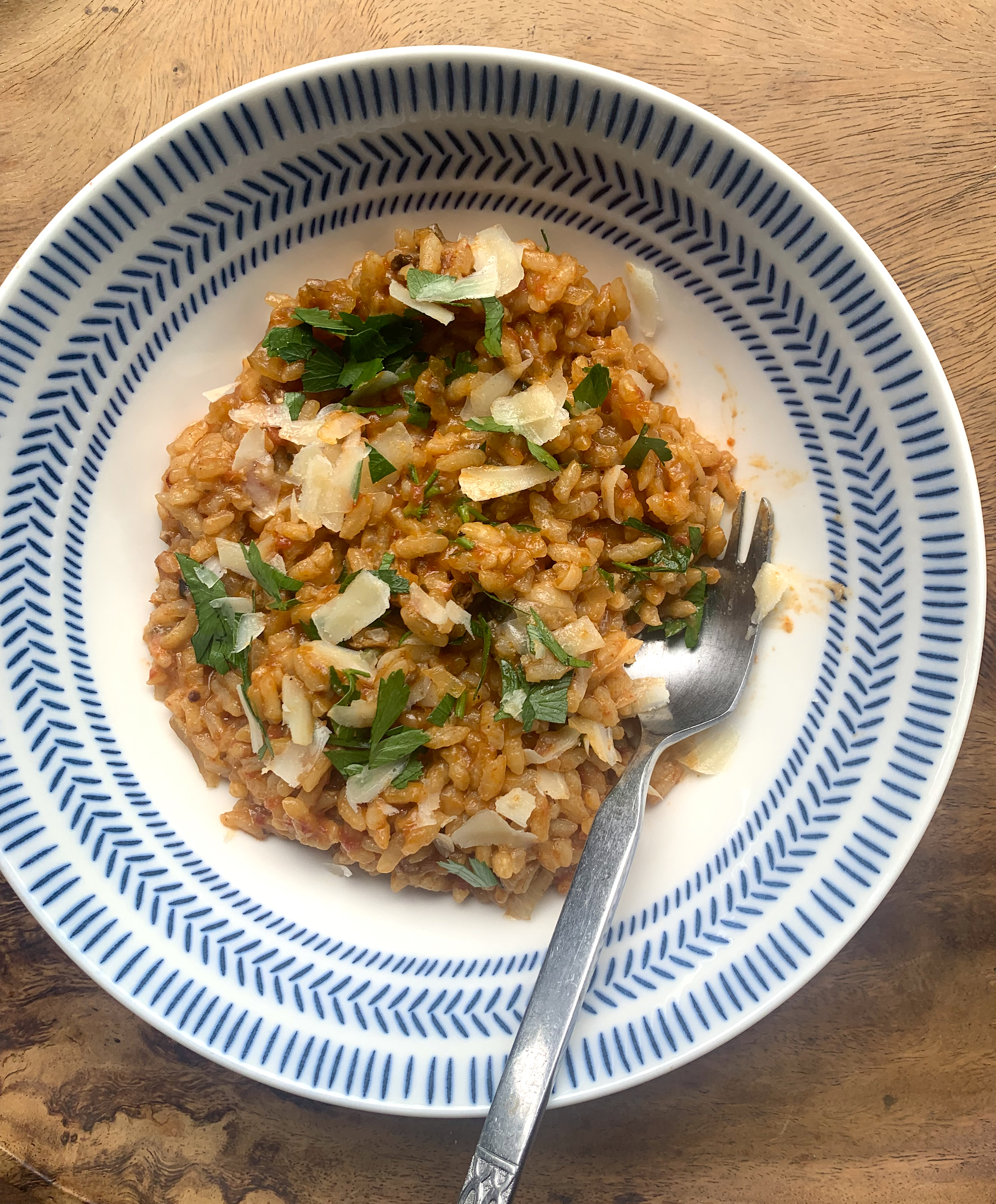 This risotto is made using an absorption method rather than the traditional method of gradually adding the hot stock to the rice over twenty or so minutes of extreme vigilance to get the perfect al dente risotto. This simplified method is less labor intensive and a more foolproof way of getting a creamy, al dente risotto.