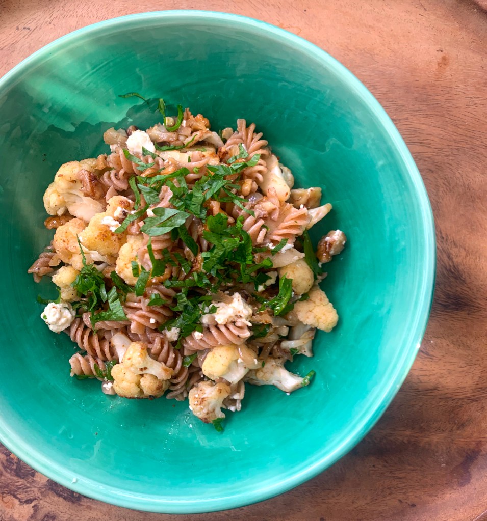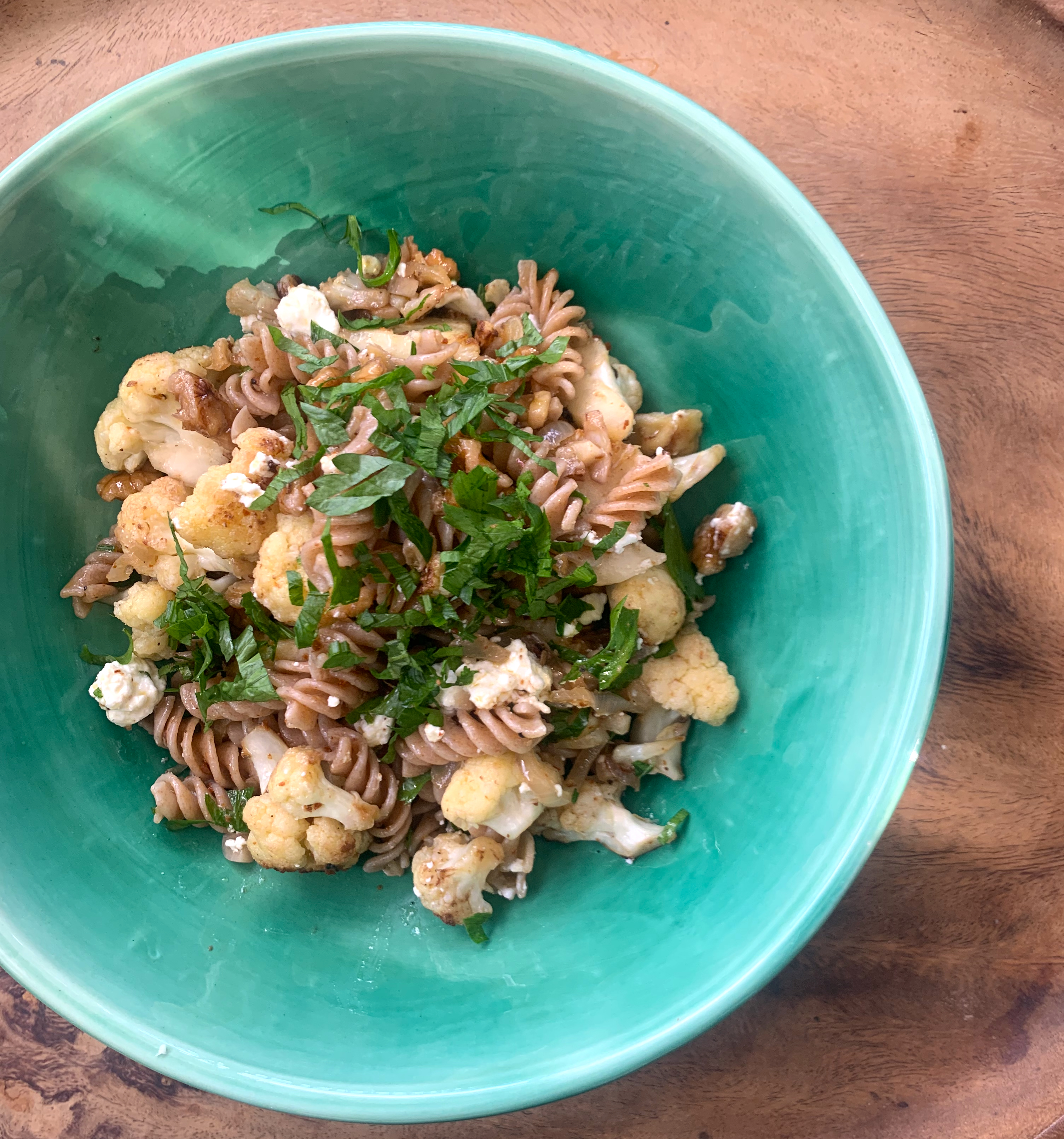 The orginal recipe comes from Alice Waters’ book Chez Panisse Vegetables. I’ve adapted it from the original by halving the pasta and cauliflower. The original recipe makes a ginormous amount of pasta and even though it makes excellent leftovers it was still a bit too much for my small family. The currants are an optional add on but I love the pops of sweetness against the saltiness of the feta. This makes a generous amount of pasta to feed 3-4 people but served at room temperature it also can also pass as pasta salad and as a side in a bigger spread.