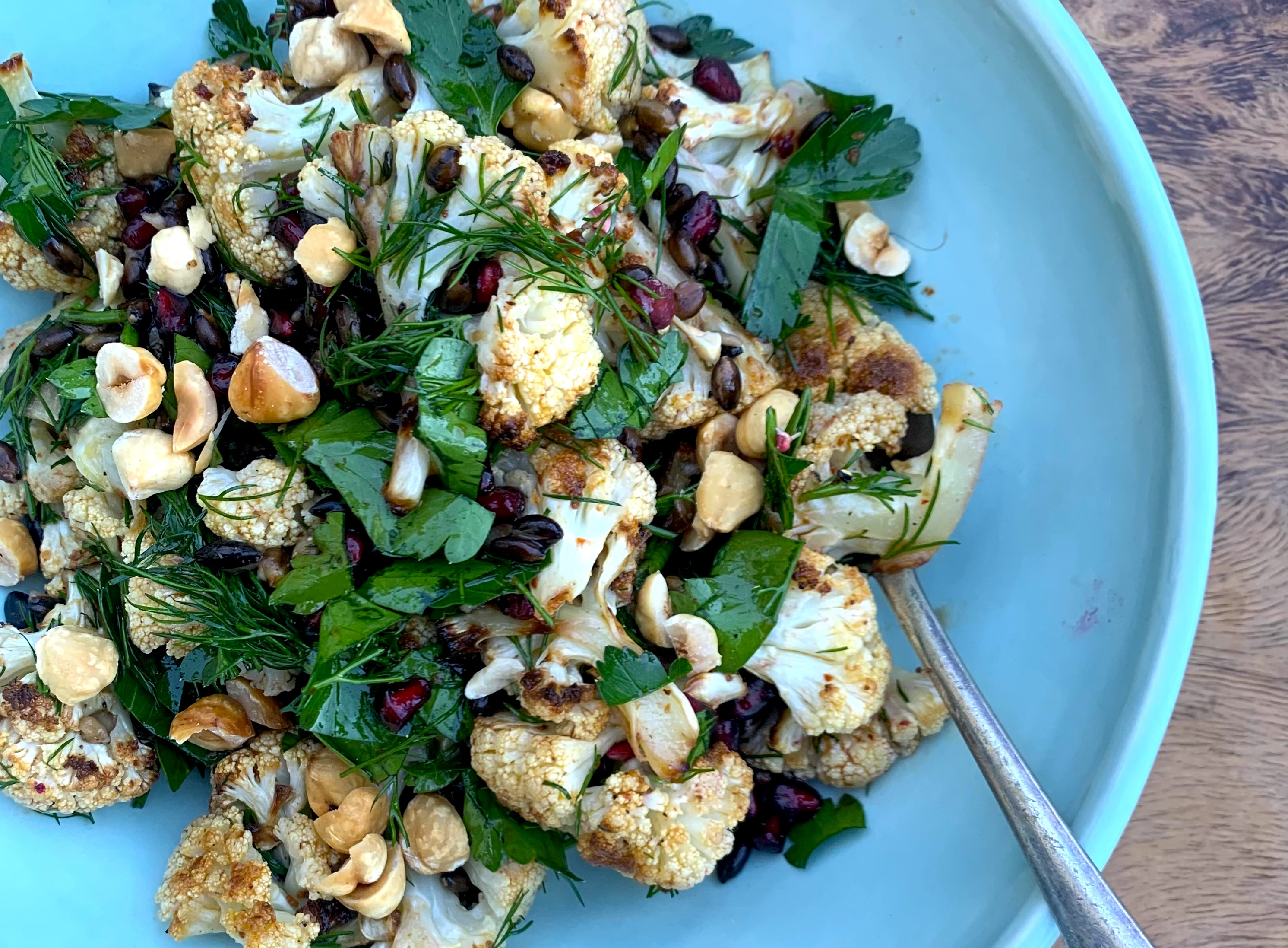 - To assemble salad – In a large bowl place cooled cauliflower and black barley. Add pomegranate seeds, herbs, celery. Dress with salad dressing and toss through. Taste for seasoning.