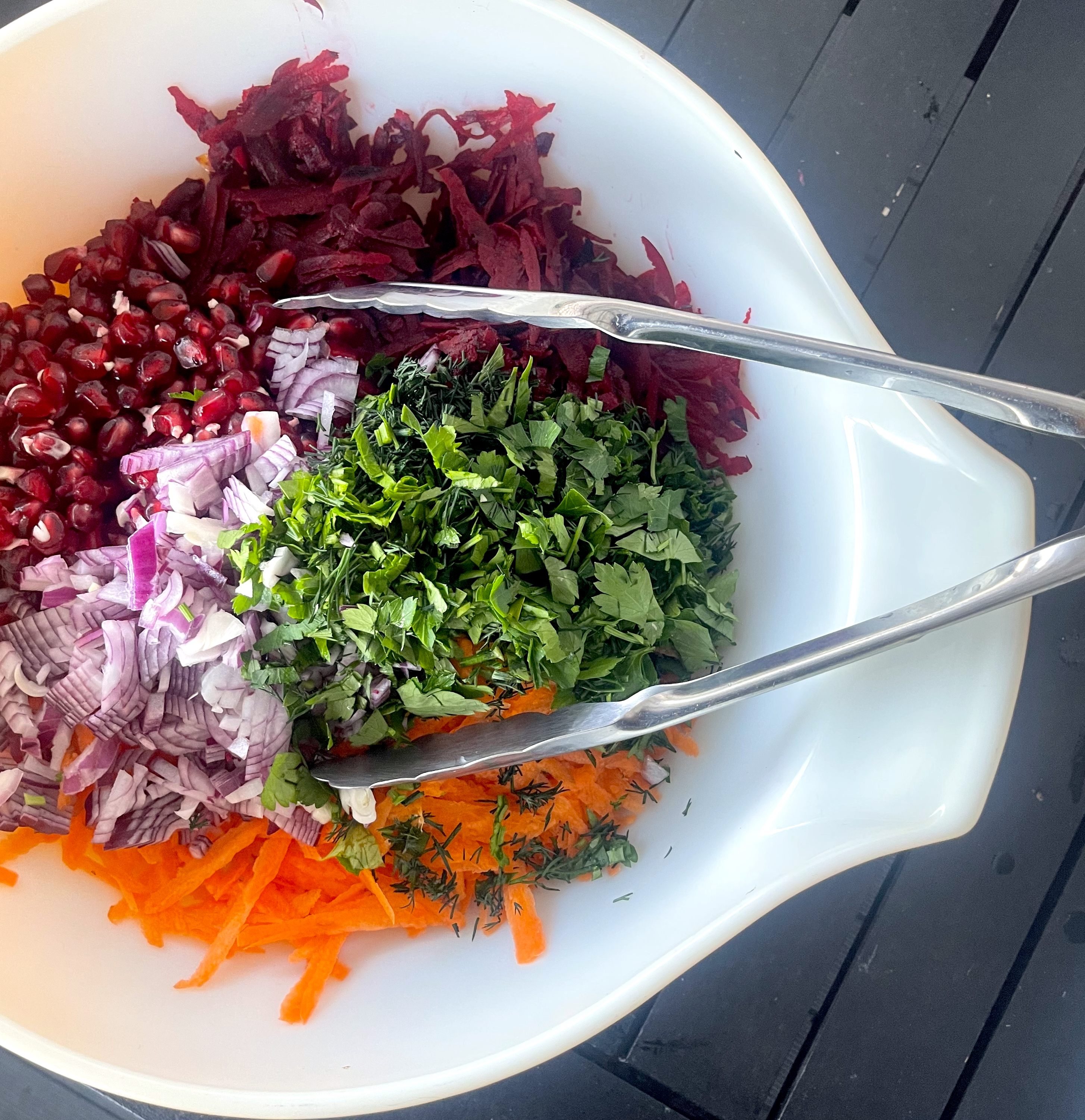 - In a large bowl mix together beetroot, carrot, onion, herbs and pomegranate seeds. Mix through dressing, season with salt and pepper to taste and you are are done!